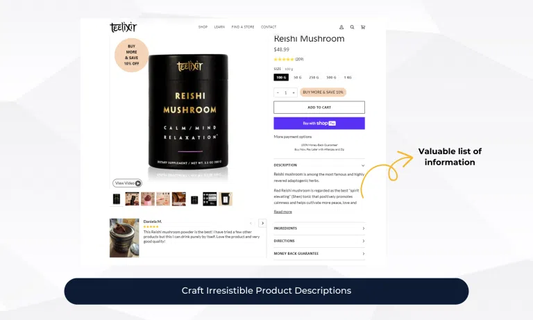 If you’re looking for ways to increase conversion rate, focus on your product descriptions. Use persuasive language and consider adding videos, user-generated content, like reviews, social proof, and testimonials, to build trust. Provide clear instructions on how to use the product, purchase safety guarantees, etc., so there is safety of their purchase.