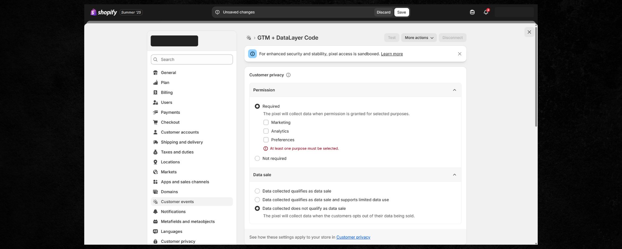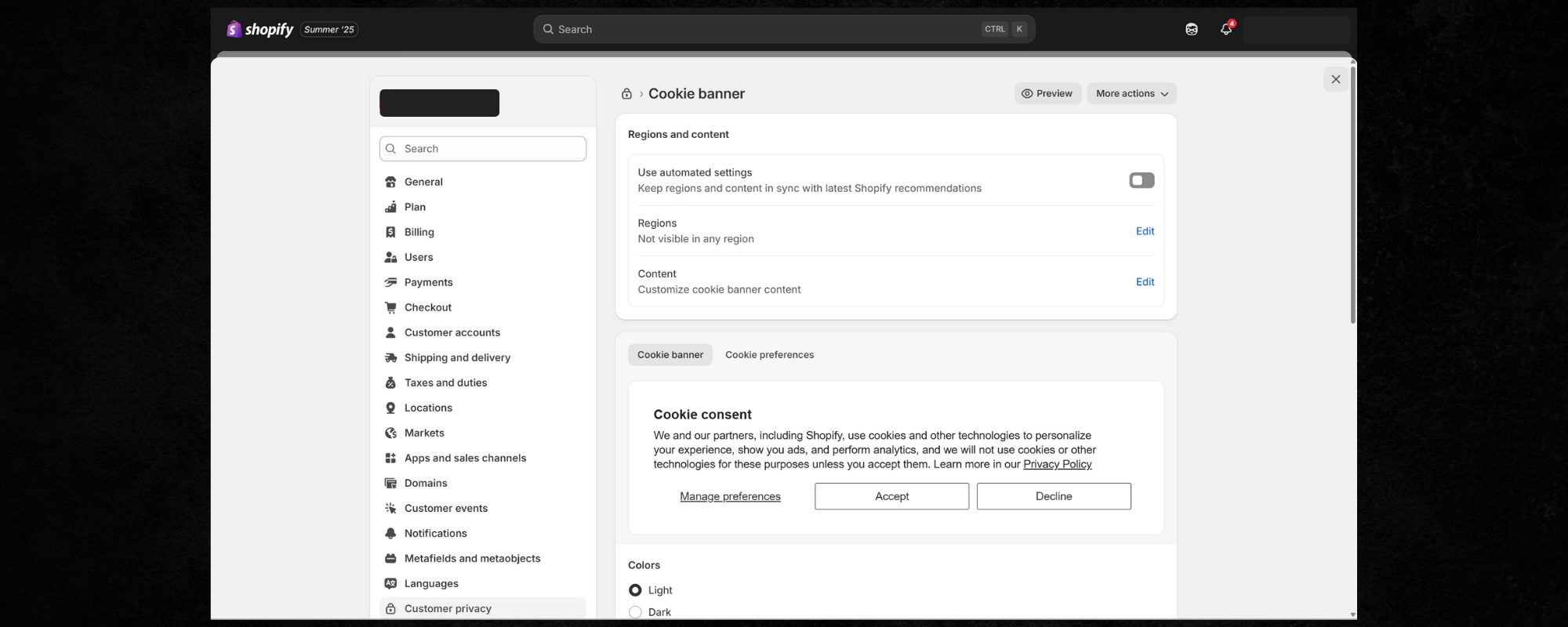 Shopify’s built-in banner collects user input and writes it into the Privacy API. It supports both required and optional categories. - Support for certain official apps