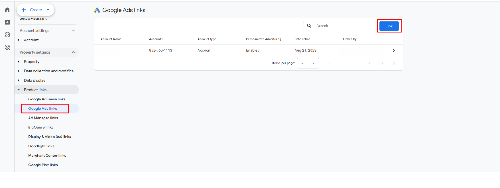 - Link Google Ads: In the Admin panel (bottom-left corner), you’ll see “Product Links.” Click that, then hit “Google Ads Links,” and start the linking process.