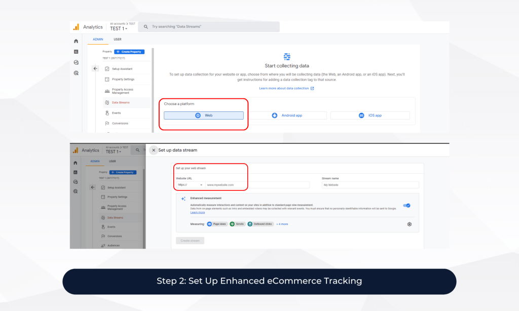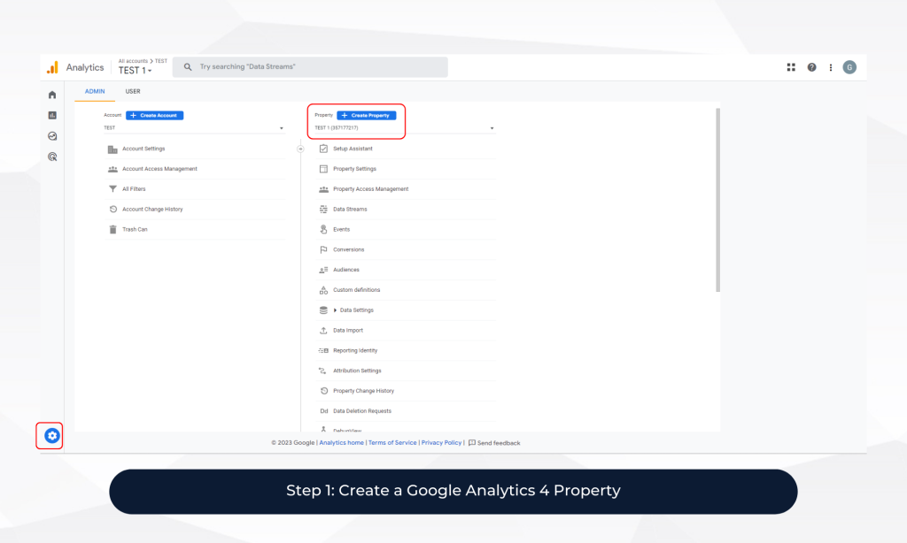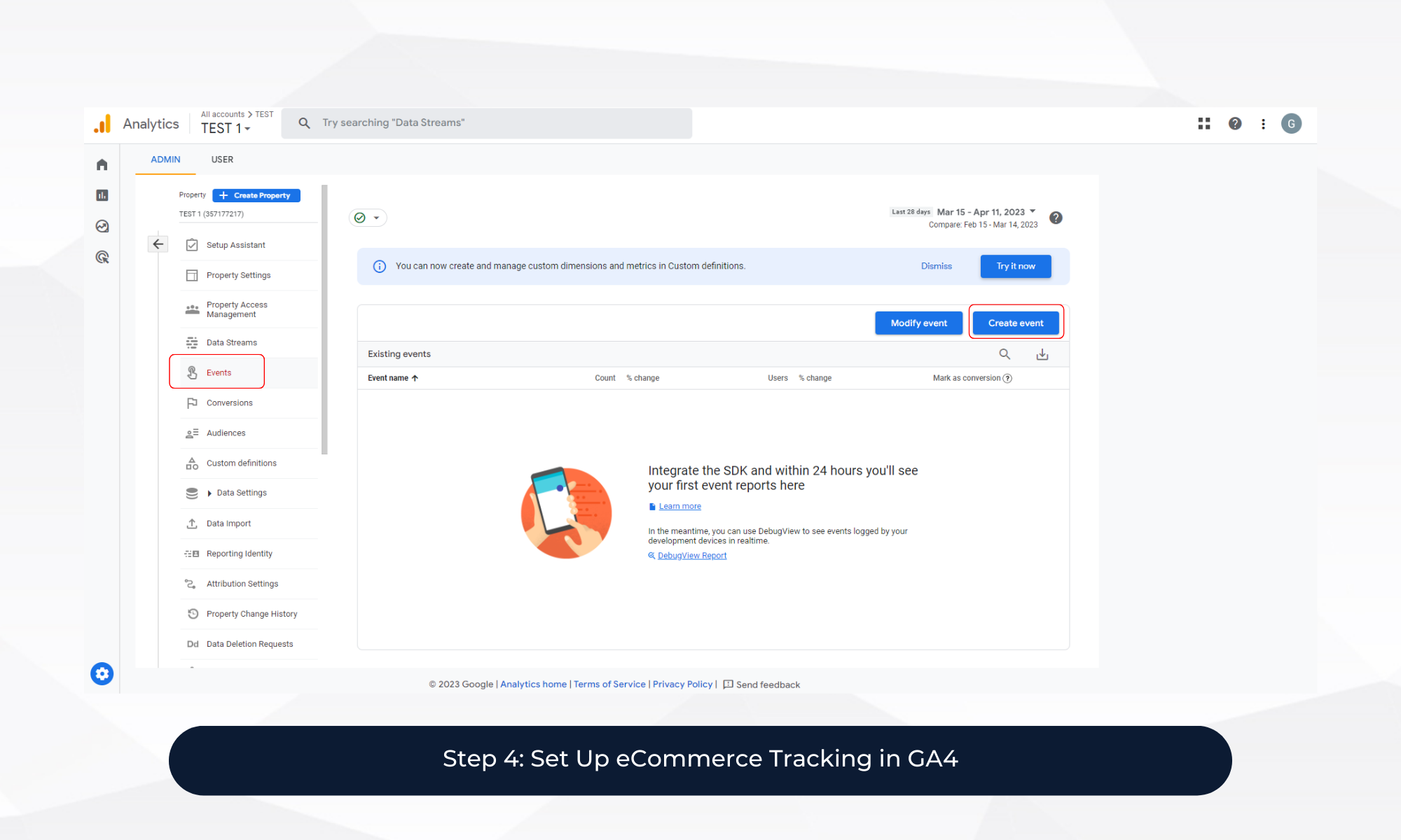 The first step is to create a new Google Analytics 4 property for your eCommerce website. To do this, log in to your Google Analytics account and click on the “Admin” tab. From there, select “Create Property” and choose “Web.”
