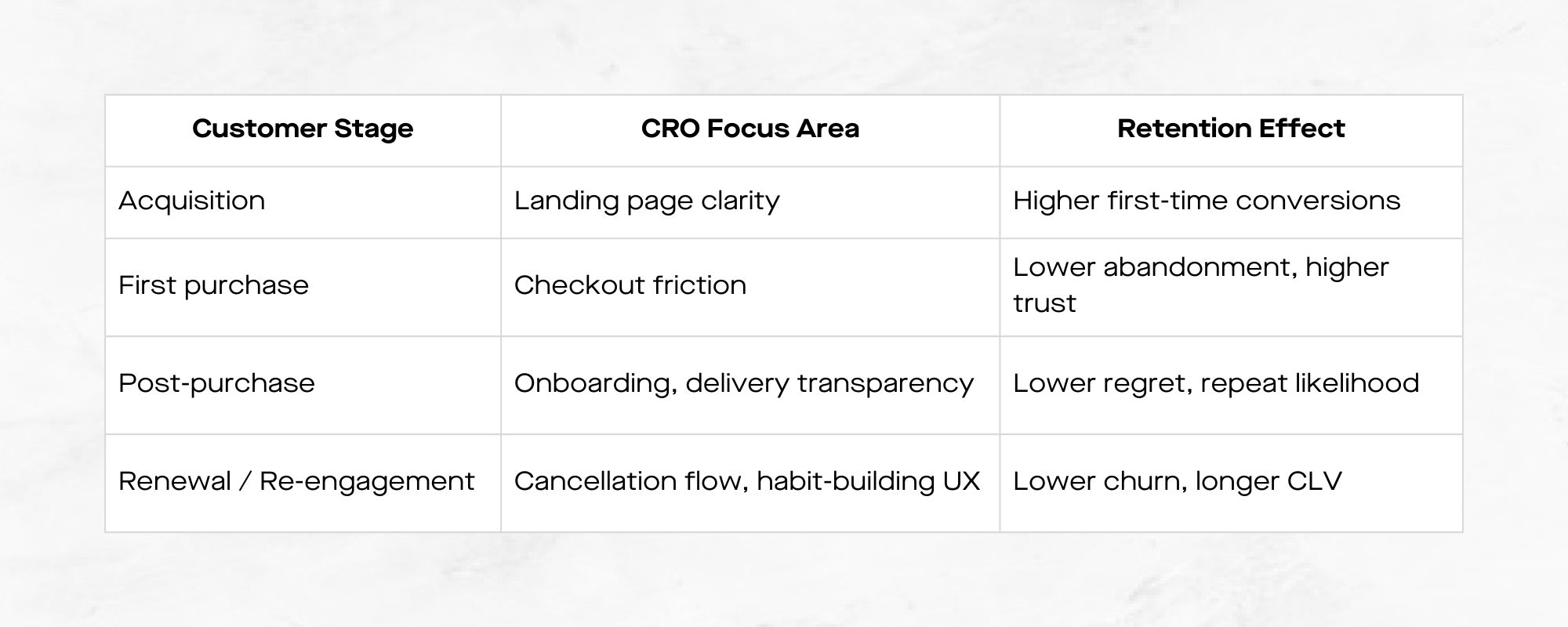 The importance of CRO in customer retention comes into play when friction beyond checkout gets removed. Every step that reduces effort or regret strengthens the chance of a second transaction.