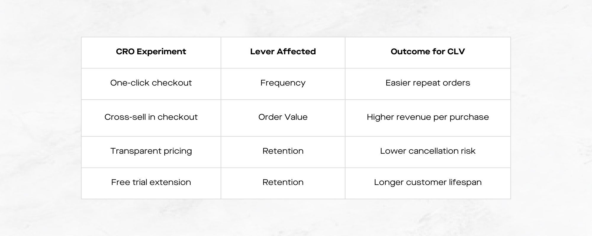 The link between CRO and customer lifetime value sits inside three levers: order value, purchase frequency, and retention length. Each lever can be moved by targeted experiments.