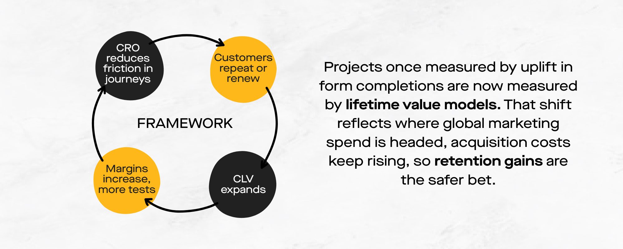 CRO is often sold as a way to lift conversion rates. In practice, its strongest function is protecting and expanding CLV. Every experiment that keeps a customer for one more order or one more renewal multiplies revenue far more than a single new signup ever could.