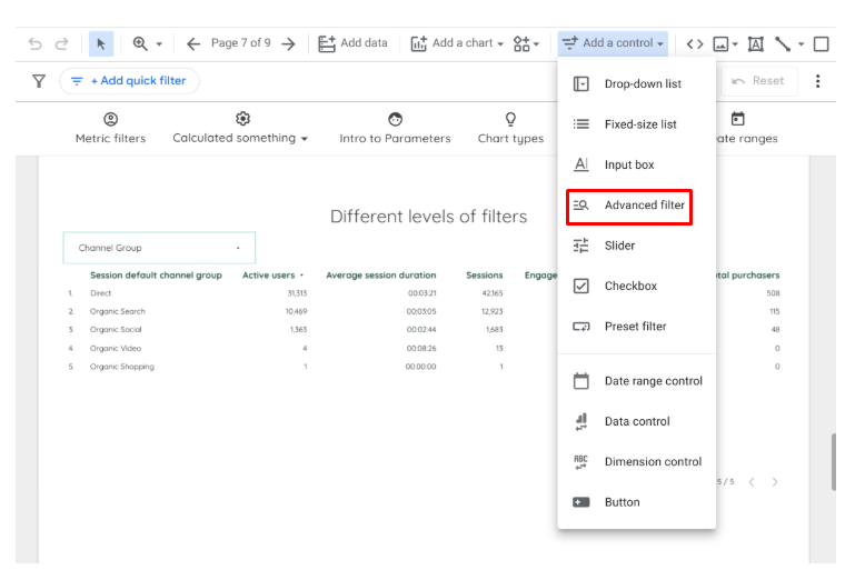 Looker Studio provides several types of filters that cater to different reporting needs: