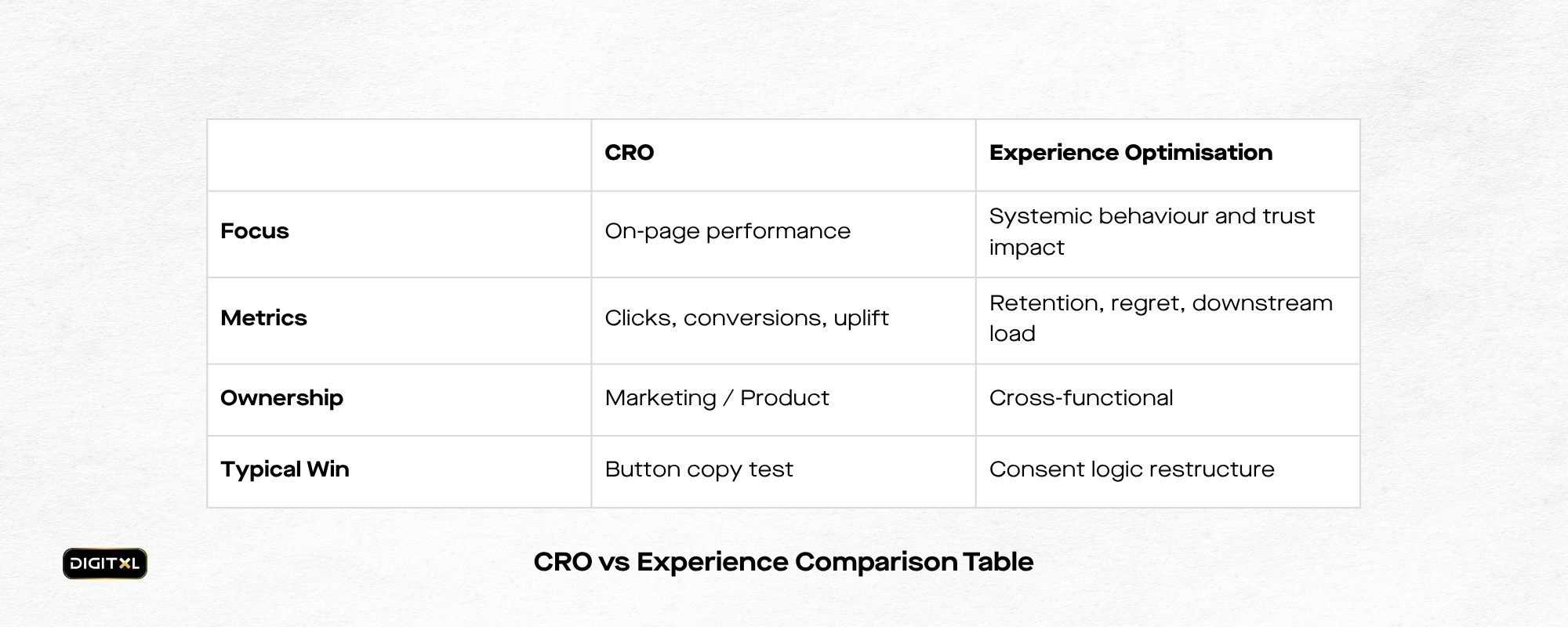 Experience optimisation asks: was that completion clear, durable, and aligned — or just technically valid?