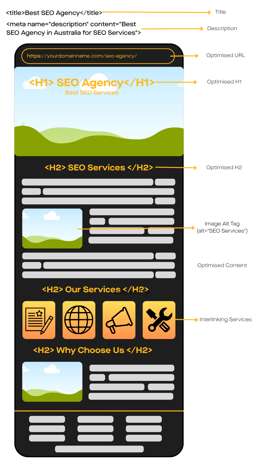 A. It’s the process of optimising your webpage’s content and structure to improve its chances of ranking on search engines like Google.