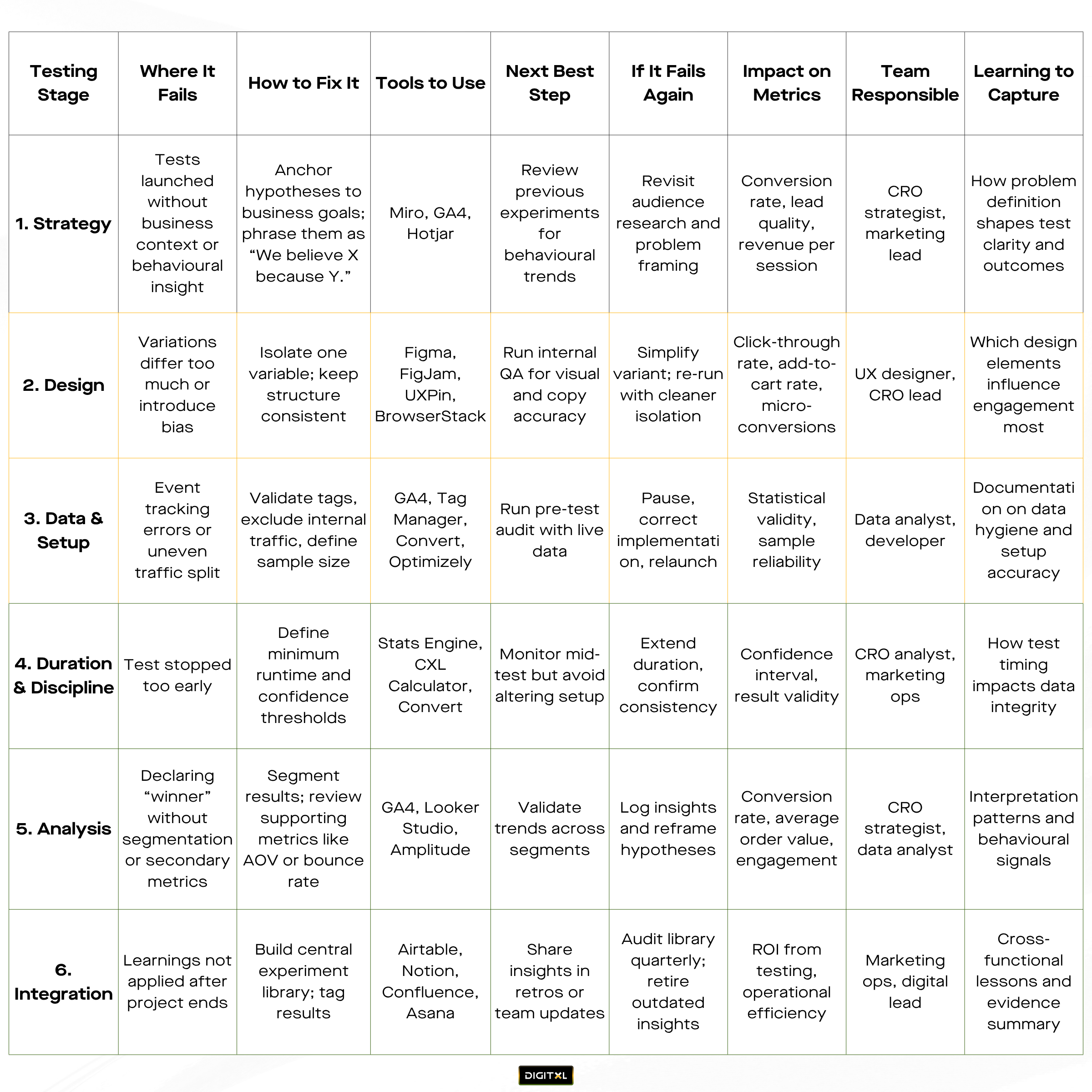 Each stage of testing introduces different points of risk and opportunity. The table below outlines how to identify, correct, and recover from common breakdowns across the full experimentation lifecycle.